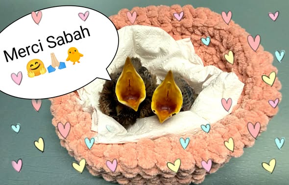 Aujourd'hui, nous tenions Ă remercier chaleureusement Sabah đpour le don de nombreux nids rĂ©alisĂ©s au crochet. Nos trĂšs jeunes pensionnaires vont pouvoir profiter de ces nids douillets. ... Comme nos deux premiers oisillons pris en charge hier : de jeunes merles noirs dont le nid est tombĂ© au sol Ă cause des intempĂ©ries. ArrivĂ©s en forte hypothermie, ils ont depuis, repris de la vigueur grĂące aux soins prodiguĂ©s par nos Ă©quipes.